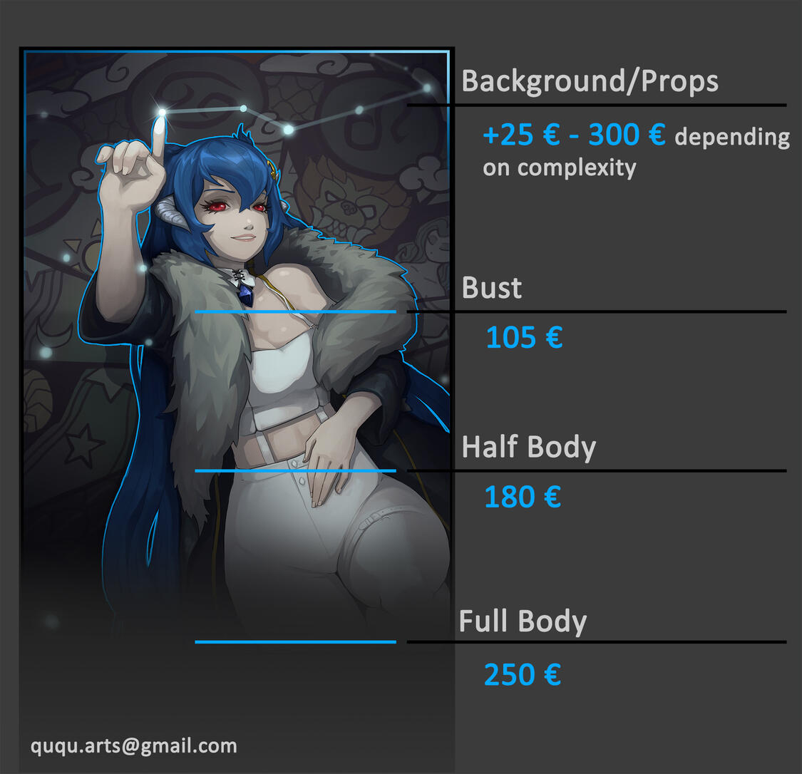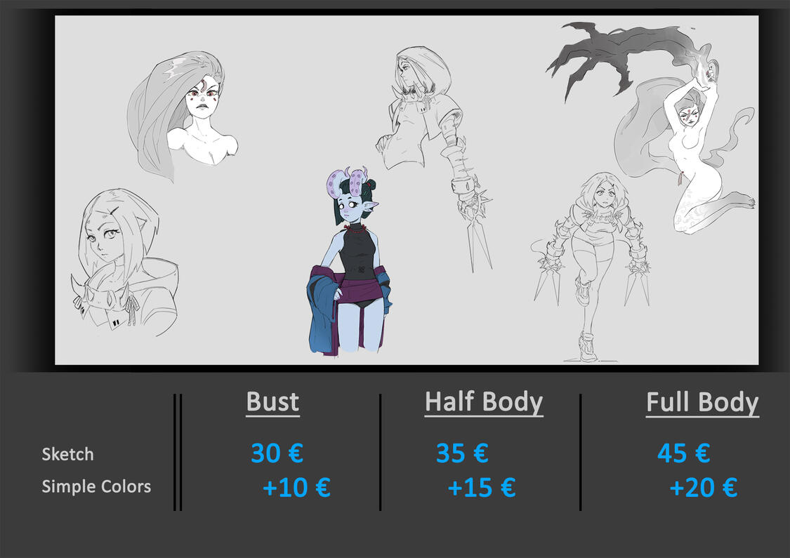 Service and Payment:You are purchasing my service to draw and a digital file.References for your character are required unless you're purchasing concept art. If no reference is given for Illustration or sketch commissions, a design fee (50% of base price) will be applied.I reserve the right to decline any commission request for work that I'm uncomfortable with or see unfit.Illustrations will be in my style, I will not try and reproduce someone else's style.The turnaround for each commission type are general approximates. A more specific completion date will be given upon commissioning. I will inform you about any potential delays. Faster delivery is negotiable but may require a rush fee.Little changes like early color adjustments are usually free of cost, however bigger changes or detail changes will come with additional costs. The exception to this is if I made an error to something you provided obvious information on earlier in the process.Initial payment is non-refundable! The only exception to this rule is if I haven‘t started working on the commission yet. After the commission is completed, no refunds can be given.I'm currently only accepting Paypal.