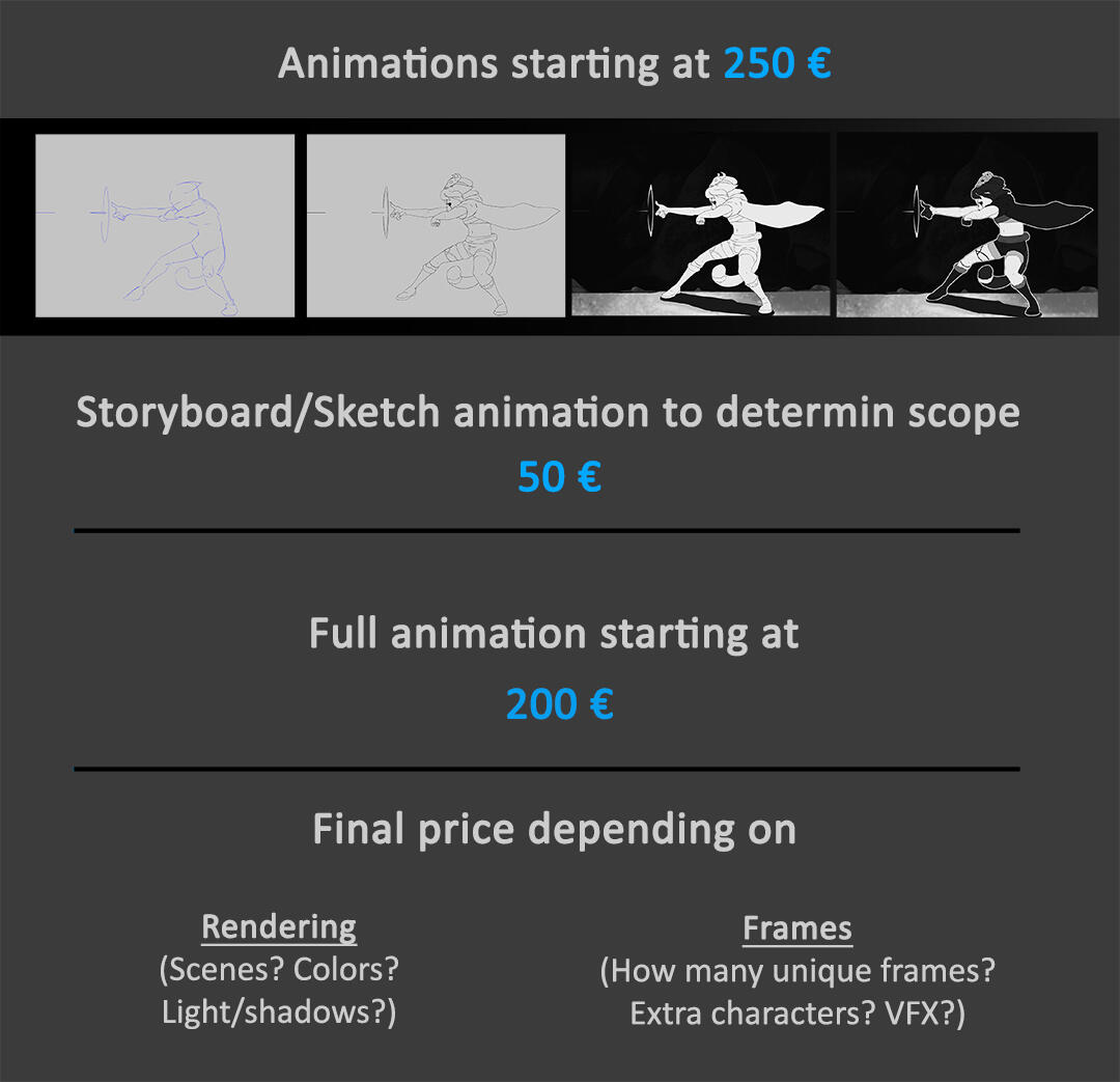 Payment: Initial fee upfront; Animation price 50% upfront, 50% for completion.